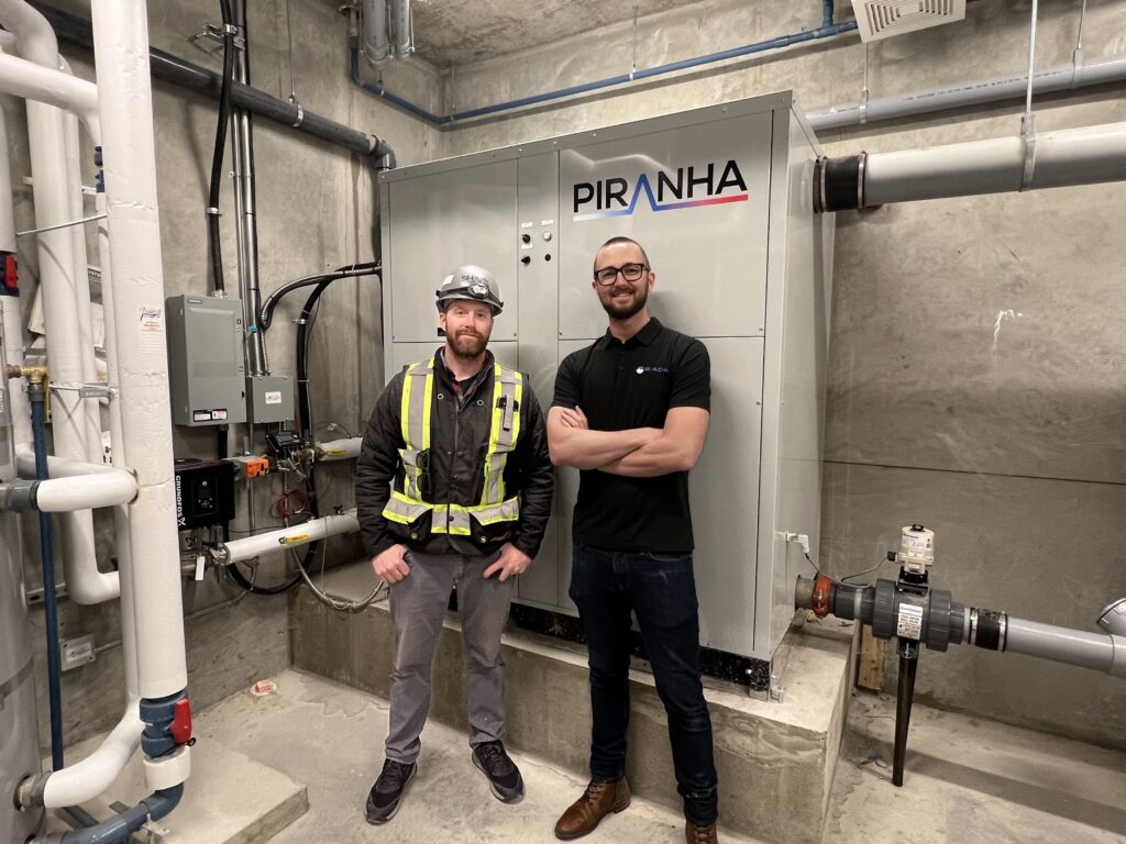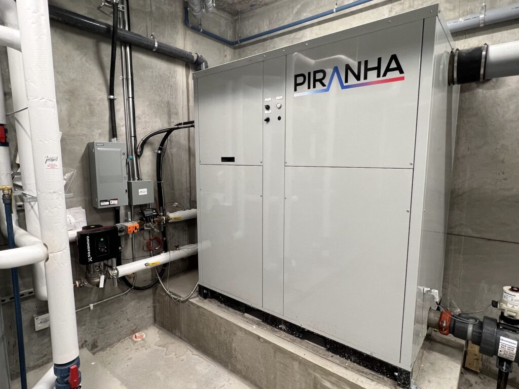 To address this, the project integrated a SHARC Energy PIRANHA waste water heat pump system. This innovative technology captures energy from warm wastewater leaving the building (from showers, laundry, and sinks), then recycles it to heat domestic hot water.